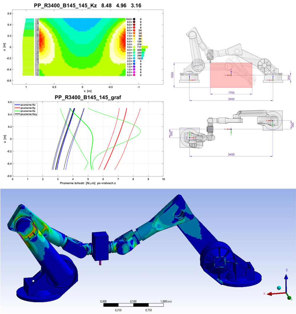 During the development of the workstation, a wide range of technologies was used to find the optimal kinematic configuration of the robots, achieving maximum rigidity while meeting the functional requirements of the workstation. This range of technologies includes analytical and FEM optimization calculations, FEM stiffness analyses of individual components, 3D scanning of the robot arms, motion simulations of the connected robots, and more.